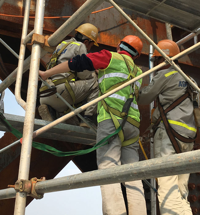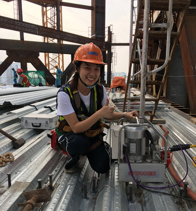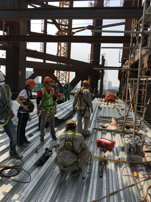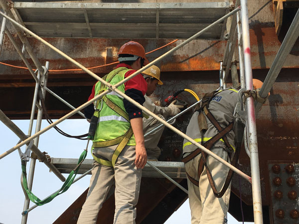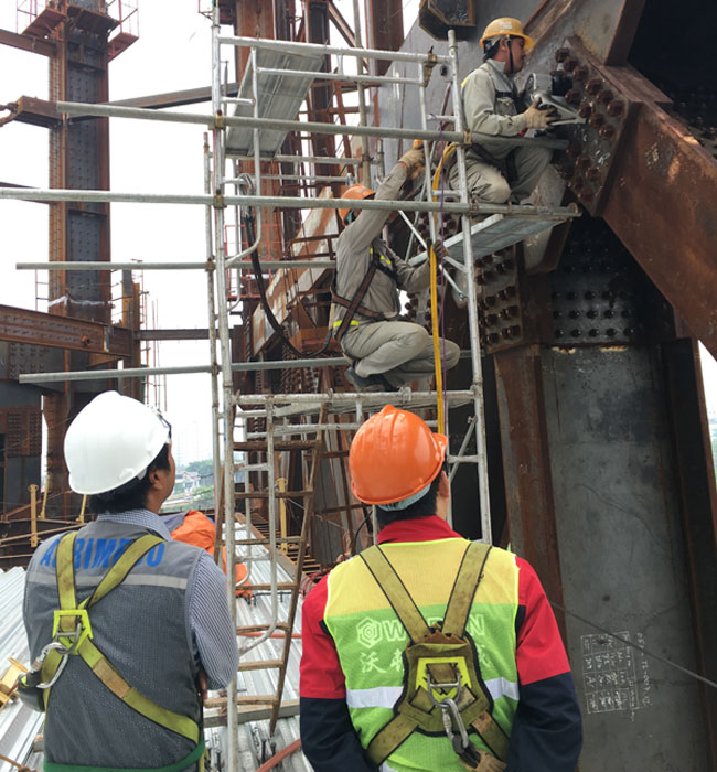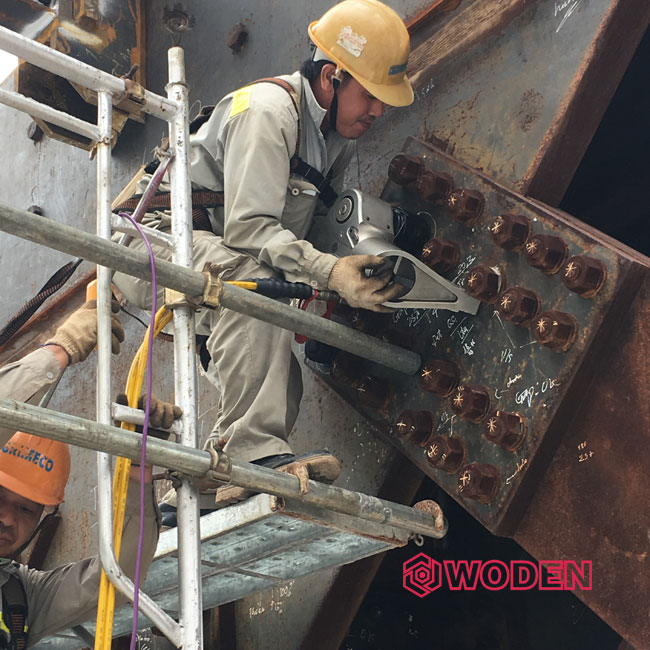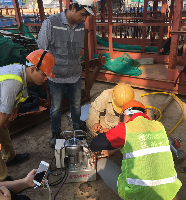 此次沃頓液壓扳手在越南應用的項目,為韓國公司承建的越南的一家銀行,全部采用鋼結構,我們的液壓扳手就用于鋼結構連接的螺栓預緊。該公司之前使用某進口液壓扳手,由于諸多原因,此次選擇中國液壓扳手,同時要求我們派遣技術人員,給他們的操作工做一個系統(tǒng)培訓,順便把他們倉庫里的進口液壓扳手進行維修。現場工作情景如下: